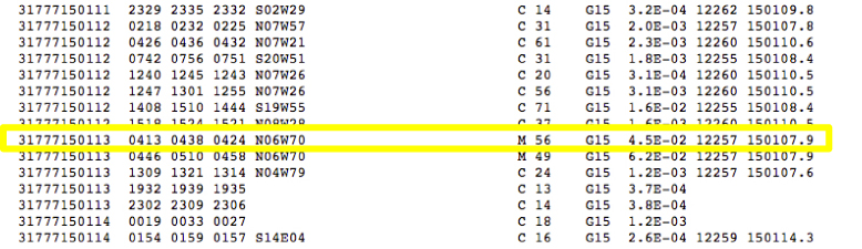 The items in the 4th column tell you the strength of the flare. SID Monitors primarily pick up flares labeled "M" or "X", the strong ones. Search down the list for an M or X type flare. Since the Sun has a cycle of 11 years, going from almost no flares to lots of flares, and back, there are some years where you won't find any X and only a few M flares. Other years, you may find a lot of them! The last solar maxmum was in 2013, so in the years after that there will be fewer and fewer flares. In our example, let's pick the M 56 flare that occurred on 13 January 2015 (31777150113). The M 56 translates to an M5.6 flare.
